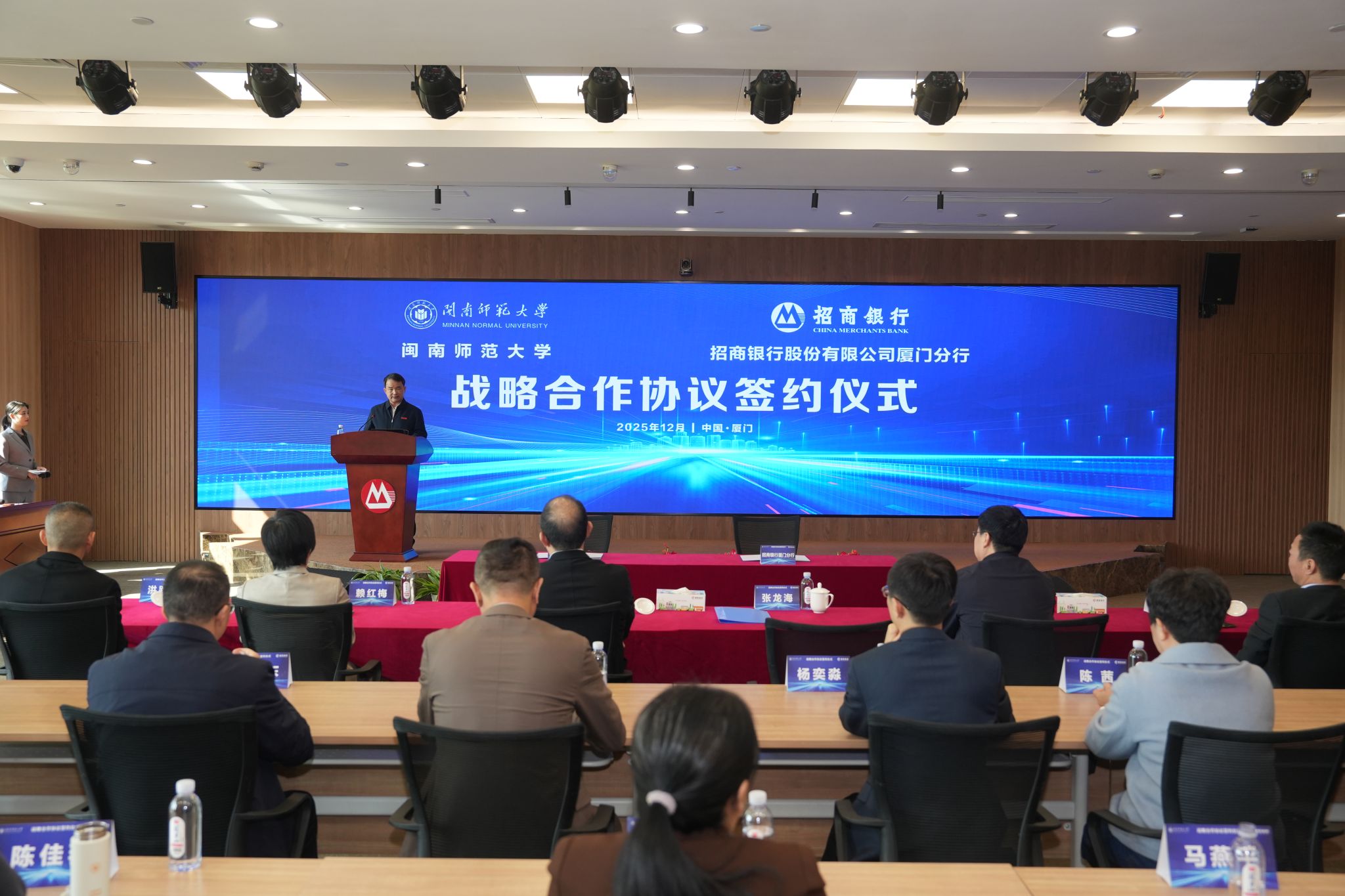 郭夏森在仪式上致辞。他表示,招商银行厦门分行将依托自身金融资源与服务优势,全力支持学校建设发展。愿与闽南师范大学深化多领域合作,推动合作项目落地见效,实现双方经济效益与社会效益最大化。